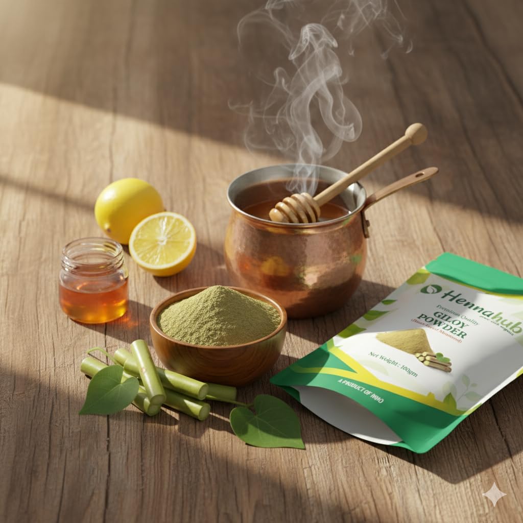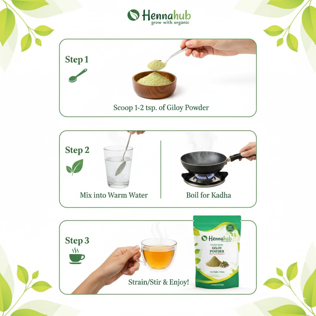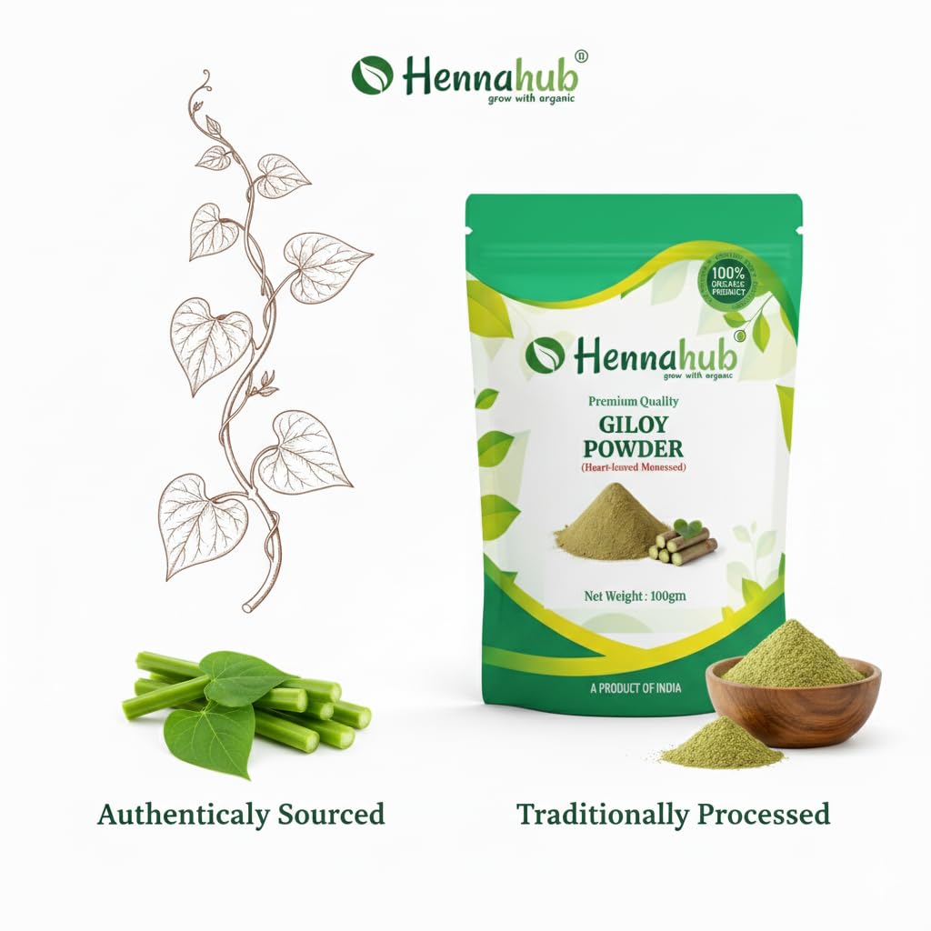 Hennahub Giloy Powder (Food Grade) - 100gm is made from pure, naturally dried stems of Tinospora cordifolia . Known for its traditional use in Indian households, Giloy is appreciated for its earthy taste and suitability in herbal drinks and homemade kadha preparations.